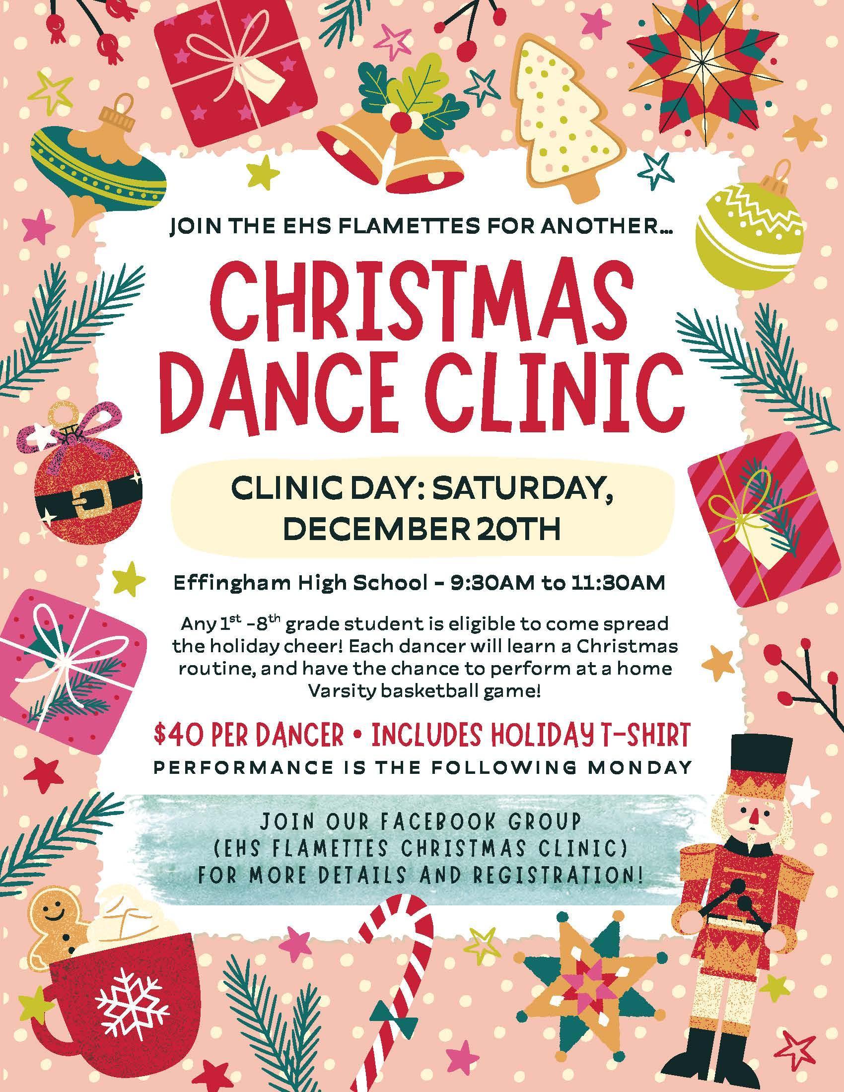 Create a holiday memory your dancer will never forget! The EHS Flamettes Christmas Dance Clinic is a fun way for younger dancers to learn, perform, and be part of our school community. Any 1st - 8th grade student is eligible to learn a Christmas routine with the EHS Flamettes on December 20th and perform at a Varsity basketball game on December 22nd.