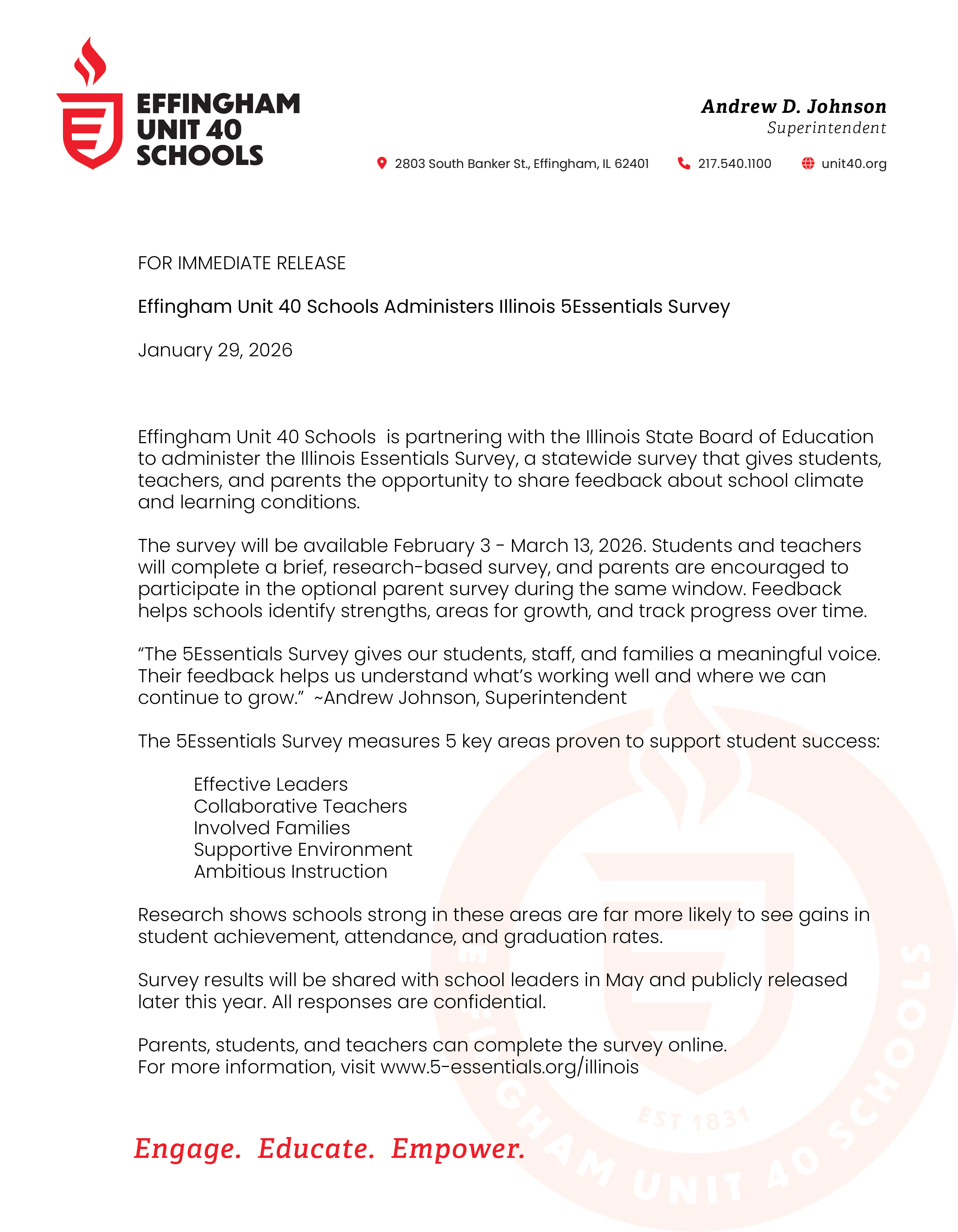 Schools across Illinois will again participate in the annual 5Essentials Survey during the months of February and March. This survey generates data that districts can use to guide their ongoing efforts to improve schools and to offer students an excellent education. The annual survey is another improvement tool that allows districts and the state to share data as a means to inform parents and community members about the school’s learning environment.